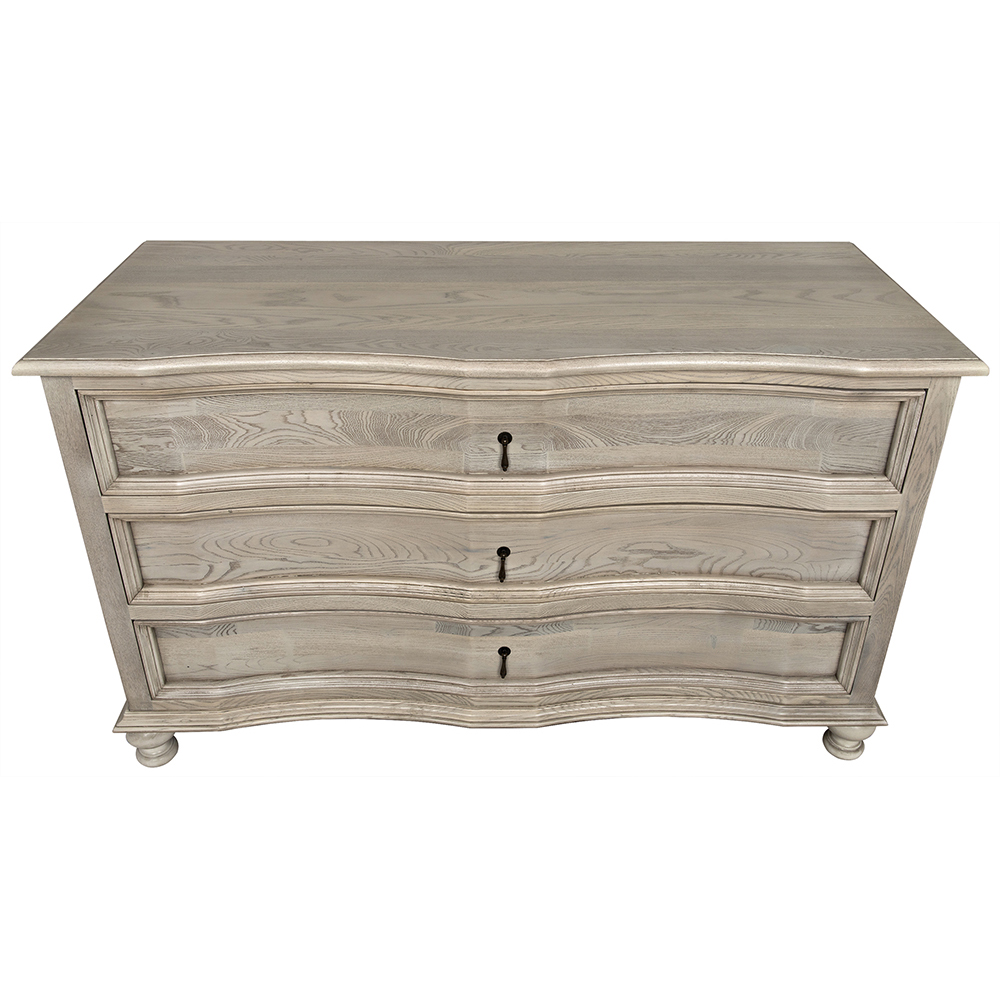Enjoy the Curved Front 3 Drawer Chest in your home today! Expert hand-craftmanship elevates the traditional lines of this solid elm dresser. Finished in a vintage gray to enhance the elm's natural grain, its features include metal runners that allow the drawers to open smoothly. Metal hardware and turned ball feet perfect the look.