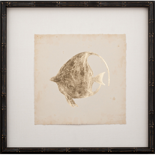 Enjoy the Gold Leaf Fish IV in your home today! Gold Leaf Fish Printed on Archival Paper, floated on oyster linen and finished in an Espresso Bamboo Frame. Hanging hardware included.