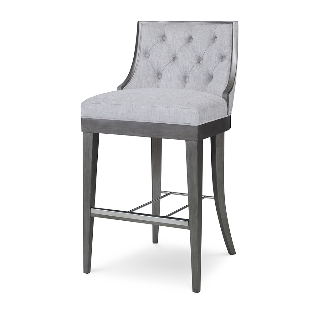 Enjoy the Andover Barstool - Grey in your home today! This tub shaped barstool features a grey finished frame, with exposed wood trim outlining the diamond tufted back. Nickel stretchers and footrest tie together the tall tapering legs.