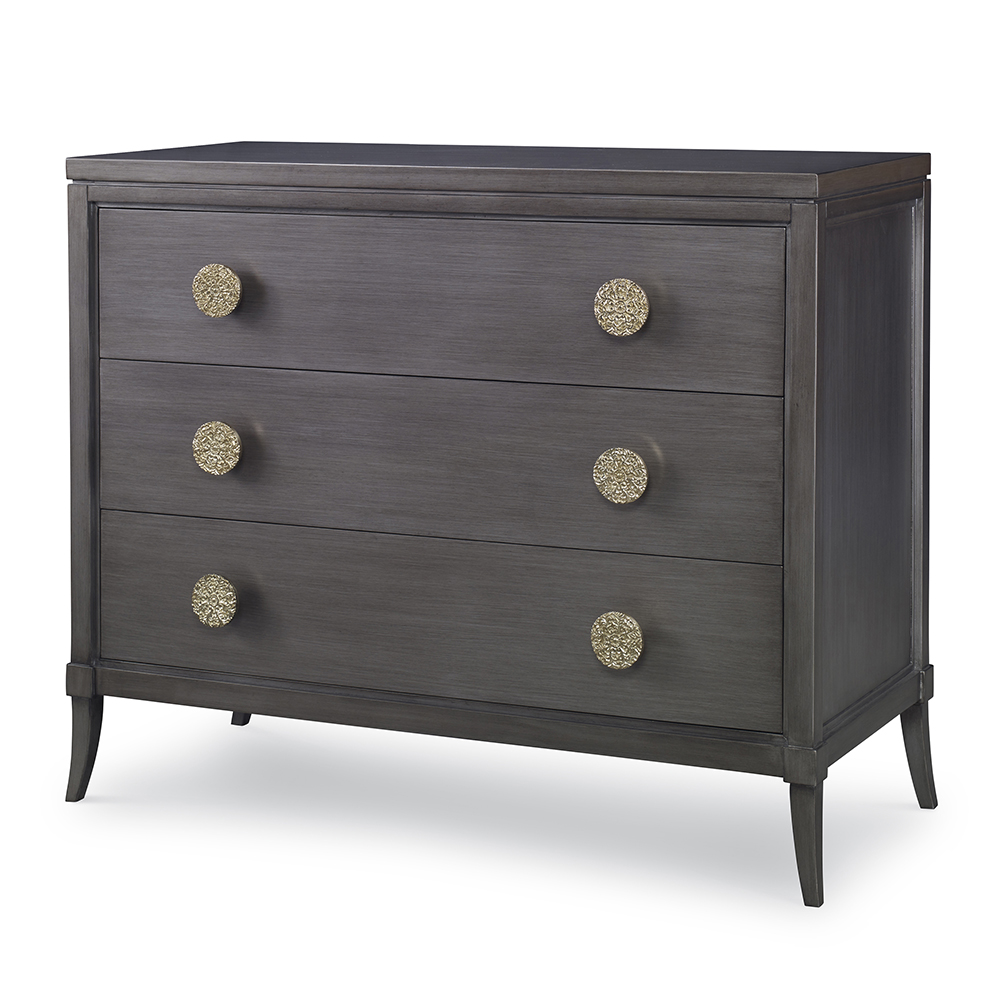 Enjoy the Cassia Chest - Grey in your home today! The Cassia three drawer chest is crafted of Mahogany solids and veneers. Tall splayed legs create a graceful silhouette further accented by the oversized intricate antique brass pulls. Drawers include soft close metal glides. Available either in steel grey or steel grey with linen drawer fronts.