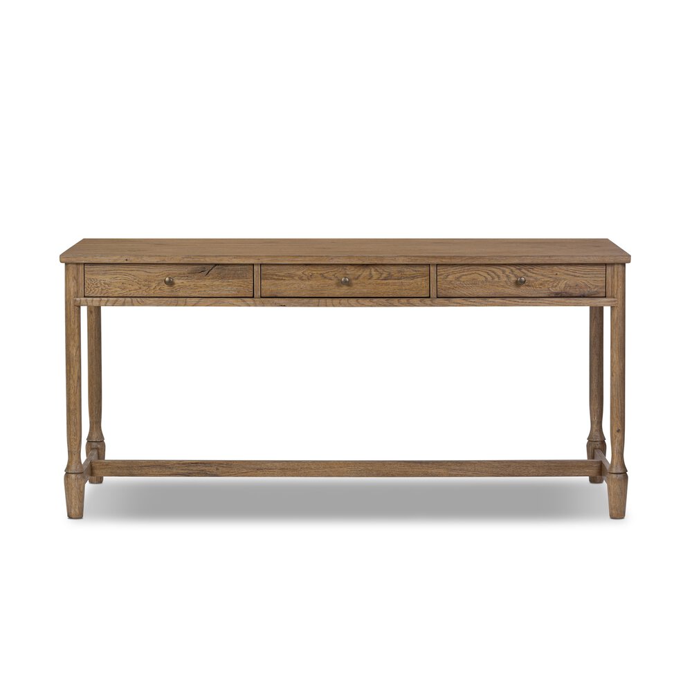 Enjoy the Amber Lewis x Four Hands Bari Desk - Weathered Oak Veneer in your home today! Small, rounded molding and turn shape legs, all crafted of timeless weathered oak. Three drawers with simple bronze hardware keep frequently used item within reach. A design collaboration by Amber Lewis and Four Hands.