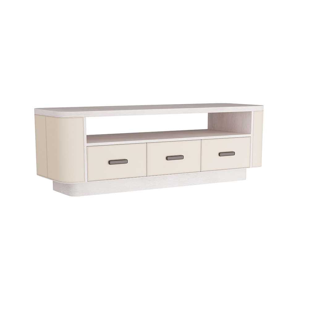 Enjoy the Teton Credenza in your home today! The Teton credenza is designed in an elegant arrangement of tonal materials. The cabinet is crafted with a smoke oak case, with an open shelf and plinth. A trio of deep drawers, sized for media use and lined in cream suede, are clad in expertly stitched ivory leather. The credenzaÂ’s curved end caps are also dressed in ivory leather. Finish will vary.