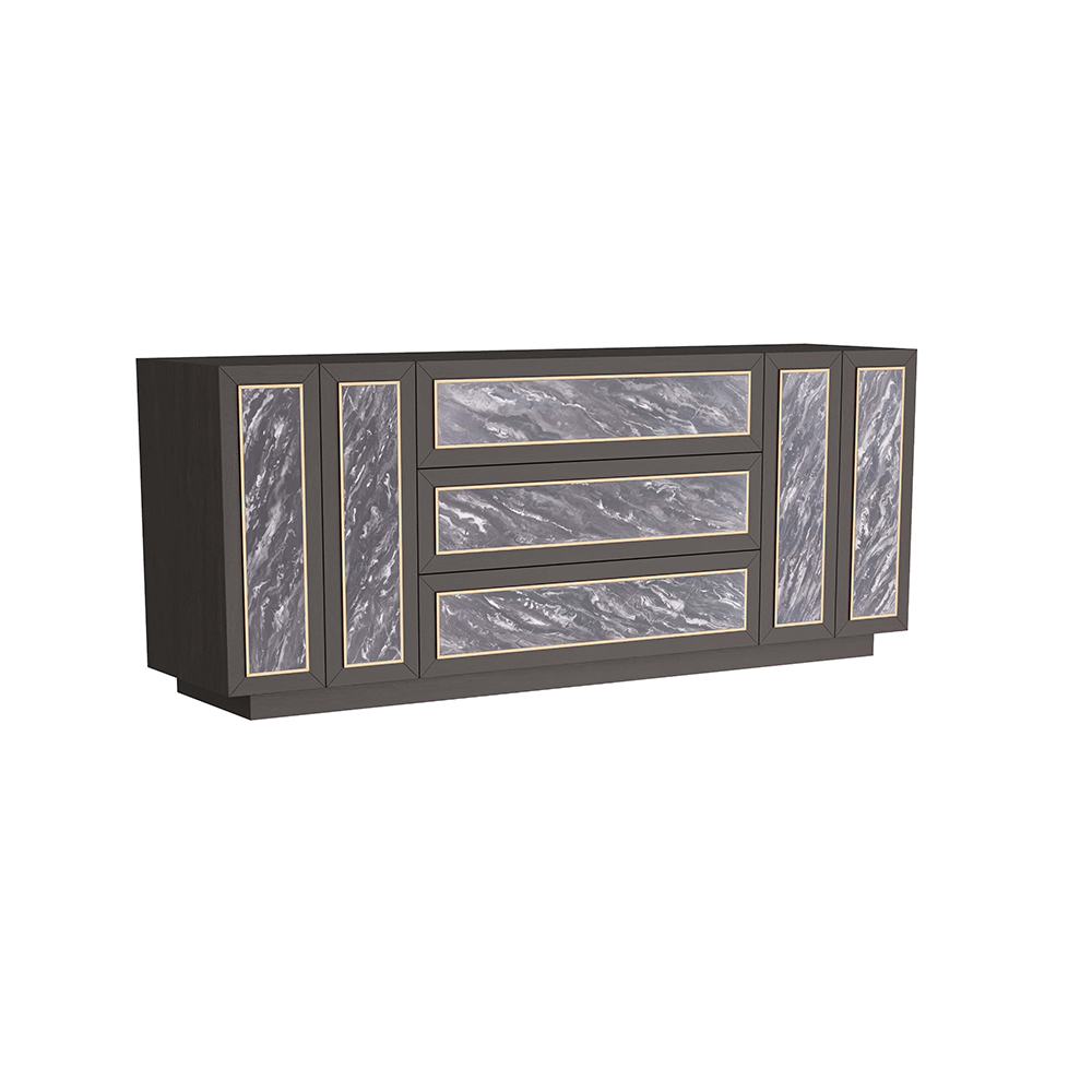 Enjoy the Vernier Credenza in your home today! Effortlessly balancing vintage character with fresh, contemporary styling, the Vernier credenza bears all the markings of a true classic. The two-door, three-drawer cabinet is constructed in a rich combination of materials and details, with panels that nod to midcentury furniture design. Ebony oak veneer encases the piece, and hand-applied resin in a gray faux marble creates the fac?ade for each drawer and cabinet door. Vintage brass forms a reveal around each faux-marble inlay for an added element of elegance. The credenza is fitted with shelves and touch-latch drawers and sits on an oak plinth. Finishes will vary.