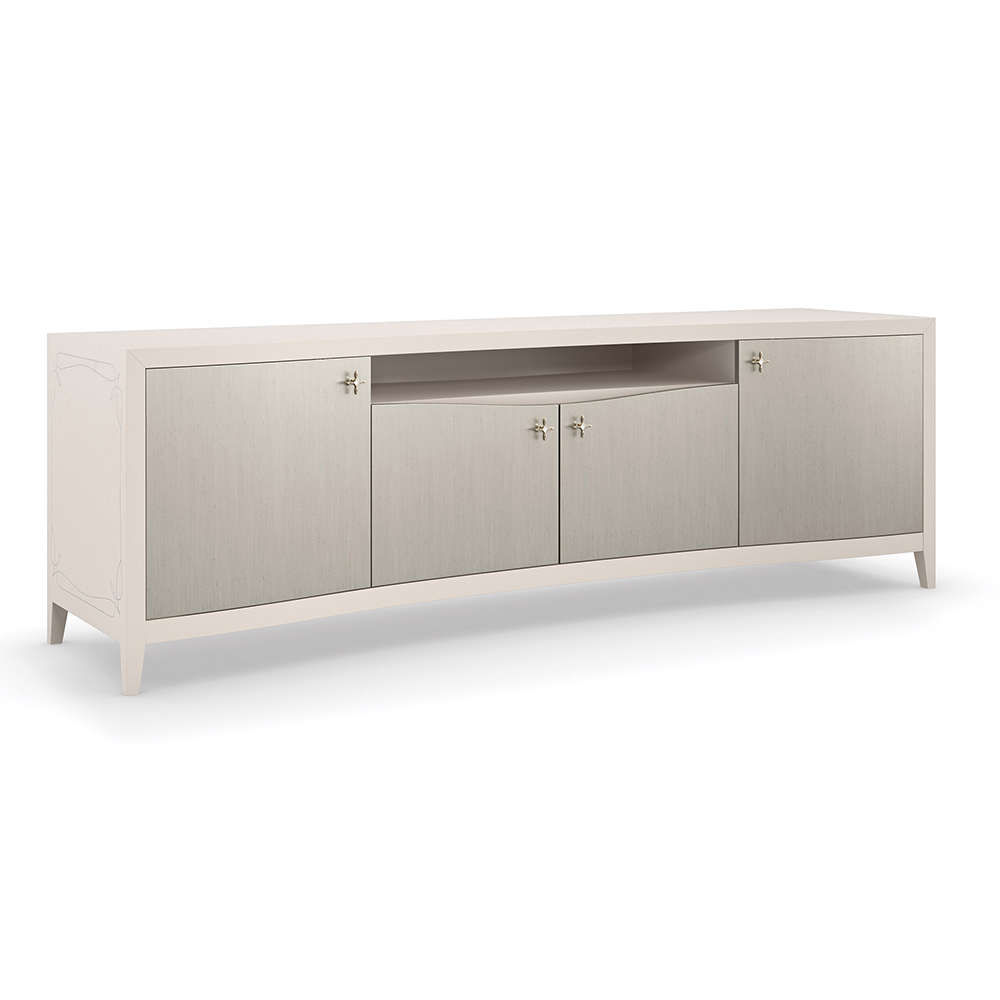 Enjoy the Full Of Charm Cabinet in your home today! With subtle curves complemented by soft silver tones, this media console makes a charming addition to any interior. A matte pearl finish gives light to the natural beauty of maple veneer, artfully accentuated by painted door fronts in Silver Charm. Adding a note of distinction: end panels screen printed with a pinstripe design and jewelry-like hardware in a stylized star shape. Features abundant storage potential with adjustable shelves and cutouts in the back for wire management.