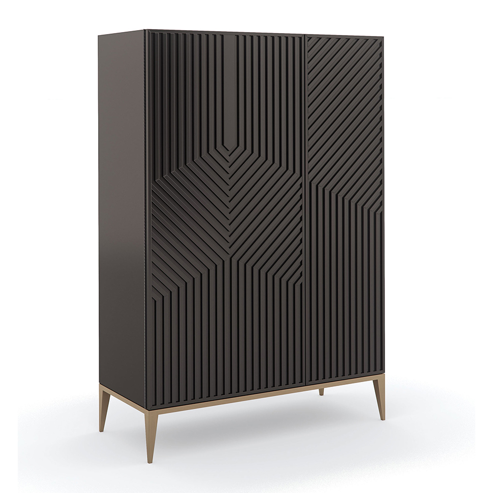 Enjoy the Out Of Line Chest in your home today! Drawing the eye with its distinctive design, this tall chest introduces a bold, modern graphic to any interior. Thin wood strips applied to the door panels create texture and a linear labyrinth for added dimension. Generous storage on the left offers five drawers with side guides and open storage on top, complemented by three adjustable shelves on the right and a full-length mirror on the back of the door for dressing. Tapered legs in Champagne Gold lend a brilliant accent and warm metallic.