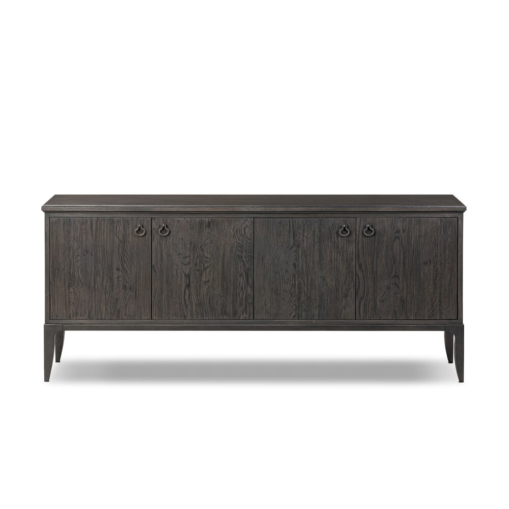 Enjoy the Alden Media Console in your home today! Baroque-period detailing gives this console a timeless look. Made from worn black oak with a metal base and ring pulls, as well as cabriole-like legs to soften the lines.