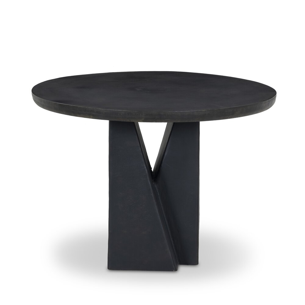 Enjoy the Aster Dining Table in your home today! An interlocking design forms this Brutalist-inspired dining table's angular base and unique window detail. Crafted from cast aluminum in an antique black finish, the table is softened with bullnosed edges and steeped in rich contrast.