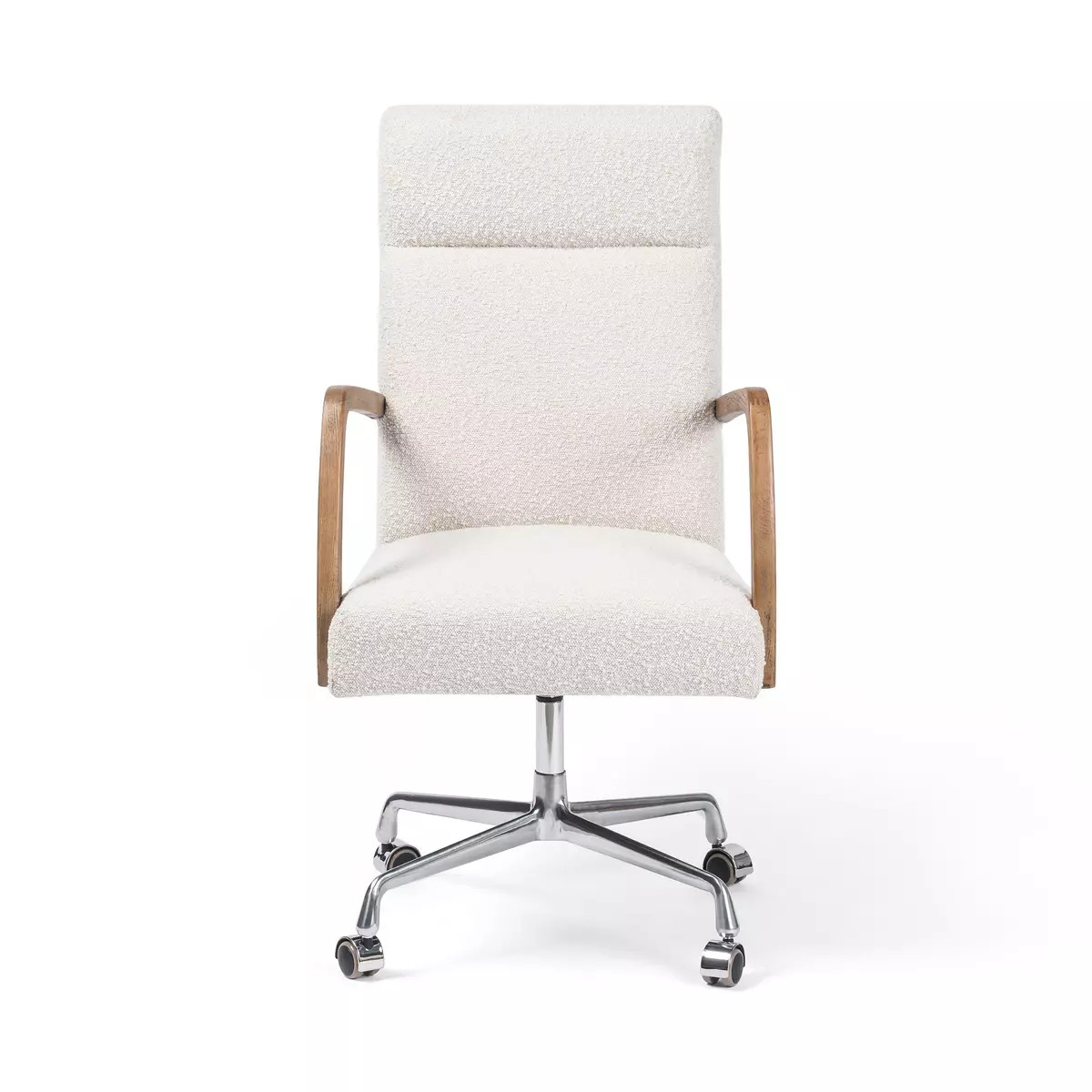 Enjoy the Bryson Desk Chair - Knoll Natural in your home today! High style. Creamy white boucle-like upholstery shapes sculpted seat and back which seem to float between elegantly arched arms of distressed nettlewood. Metal casters make for ease in the workplace. Height not adjustable.