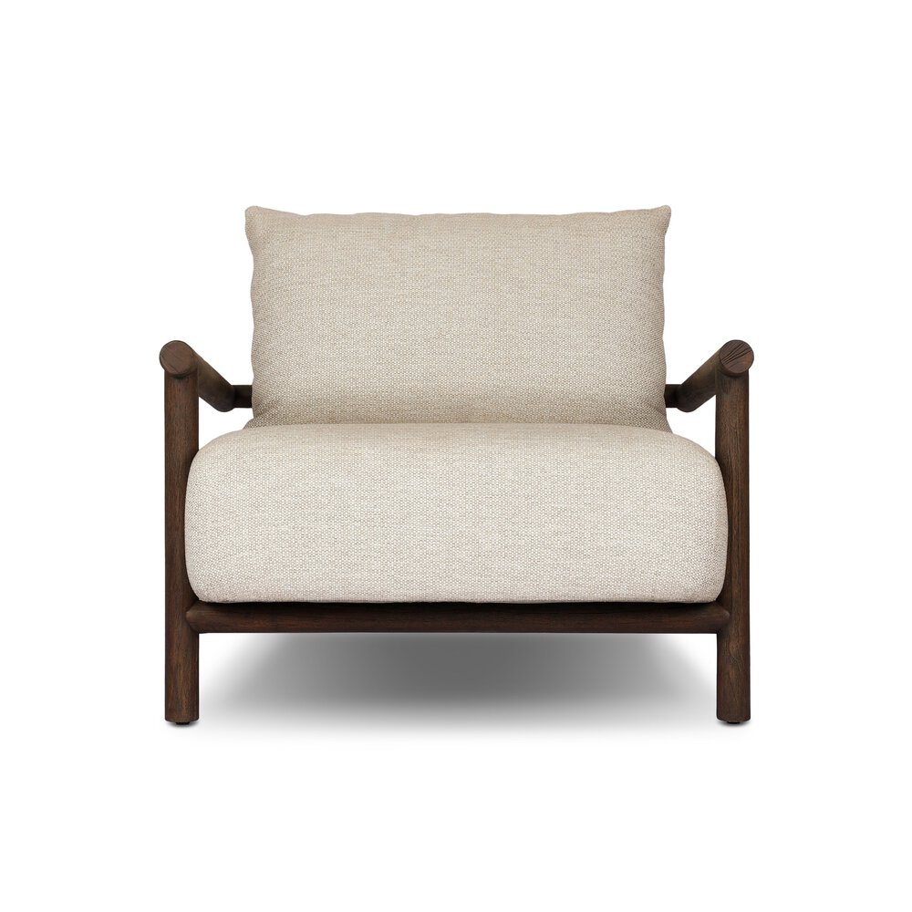 Enjoy the Cardiff Outdoor Chair - Stained Saddle Brown - Fsc in your home today! Angular FSC®-certified teak framing paired with softened dowel edges crafts a bench-made, transitional outdoor chair. Strap detailing supports the loose, knife-edge back cushion, complemented by a heavy fixed seat cushion — adding a touch of weight to the airy design. Cover or store indoors during inclement weather and when not in use.