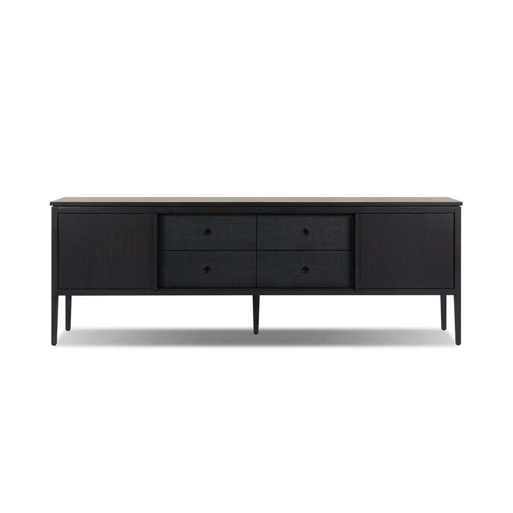 Enjoy the Dawn Media Console in your home today! Black raffia brings texture to a traditional media console of black-finished mahogany. Two sliding doors and four drawers create generous storage options, while rear cutouts keep cords out of sight.