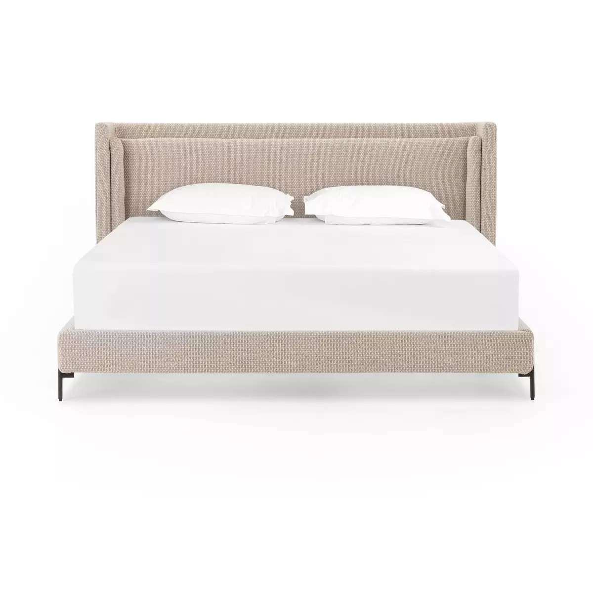 Enjoy the Dobson Bed - King in your home today! Talk about texture. An upholstered shelter-style headboard is layered for a look of great depth, balanced out by cradle legs of gunmetal-finished iron.