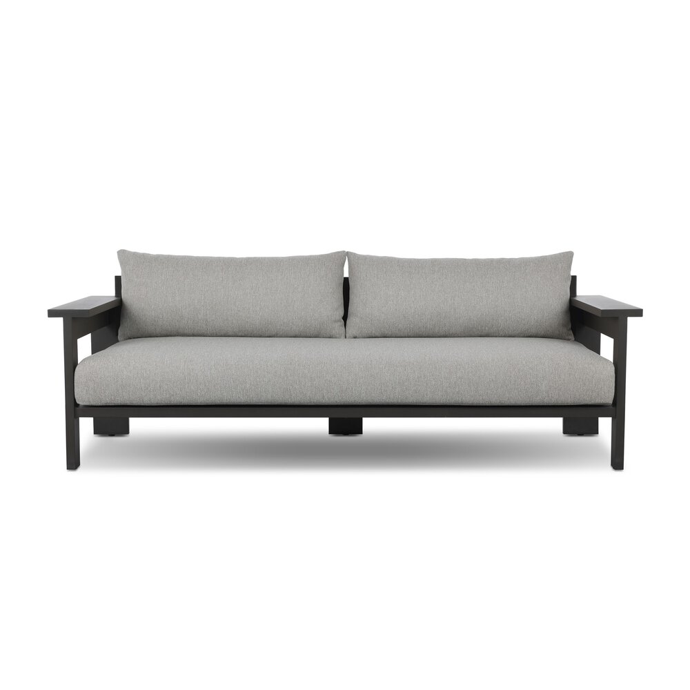 Enjoy the Hyder Outdoor Sofa in your home today! Deep bronze aluminum framing takes a traditional outdoor sofa silhouette and adds intrigue with angular detailing. Cover or store inside during inclement weather and when not in use.
