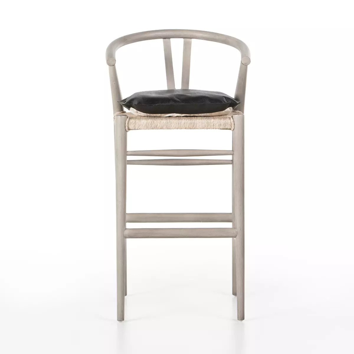 Enjoy the Muestra Bar Stool - Weathered Grey - Pebble Black in your home today! Modern curves redefine the classic wishbone-style bar stool. Vintage white all-weather wicker is woven for a dose of texture within weathered grey teak framing. Complete the look with a cushion upholstered in black top-grain leather. Cover or store indoors during inclement weather and when not in use.