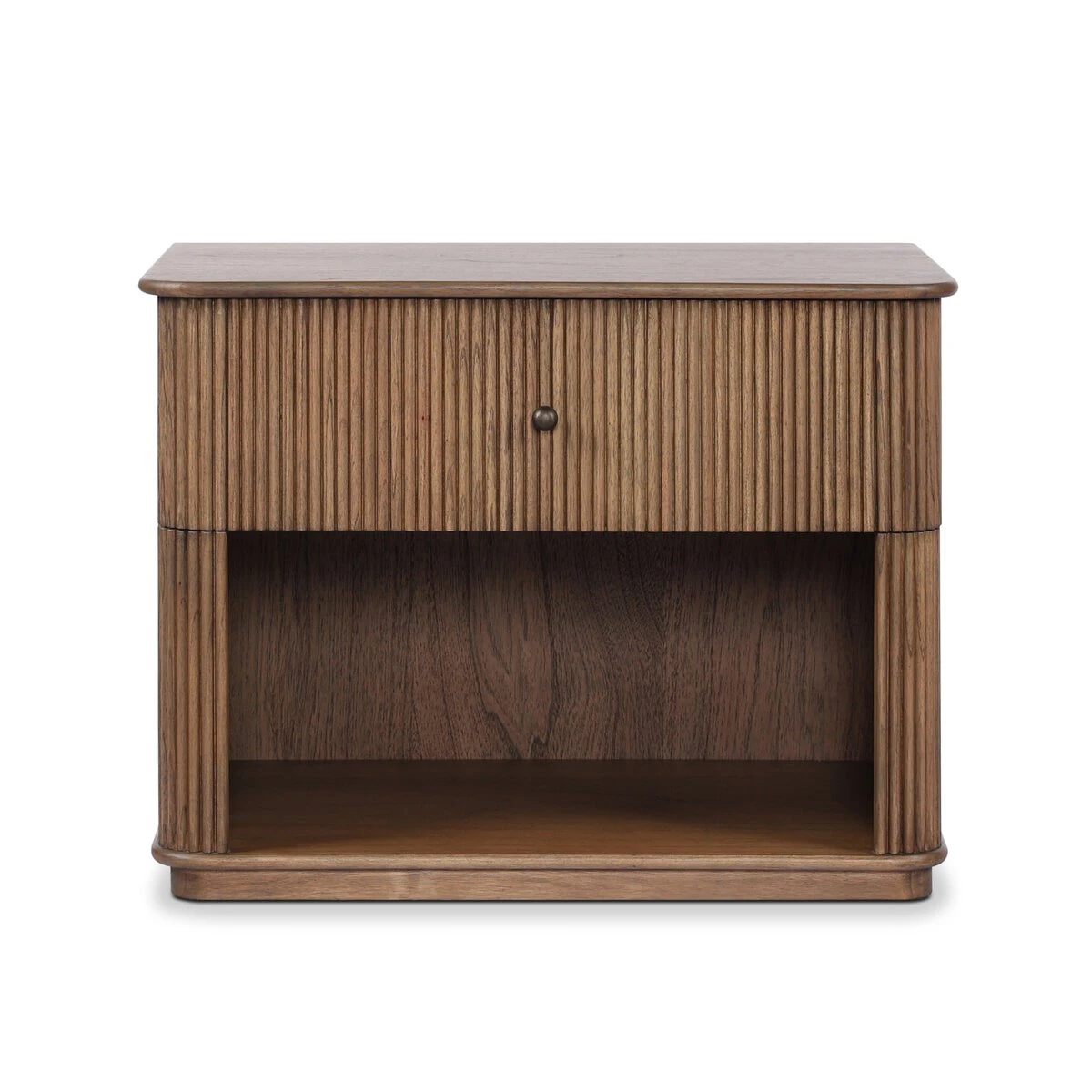 Enjoy the Ona Nightstand - Amber Mindi in your home today! An artisanal take on texture. Made from mindi wood with a plinth-style base, a reeding pattern is carved into the surface keeping this bedside look fresh and approachable. A spacious drawer, open cubby and amber finish complete the look.