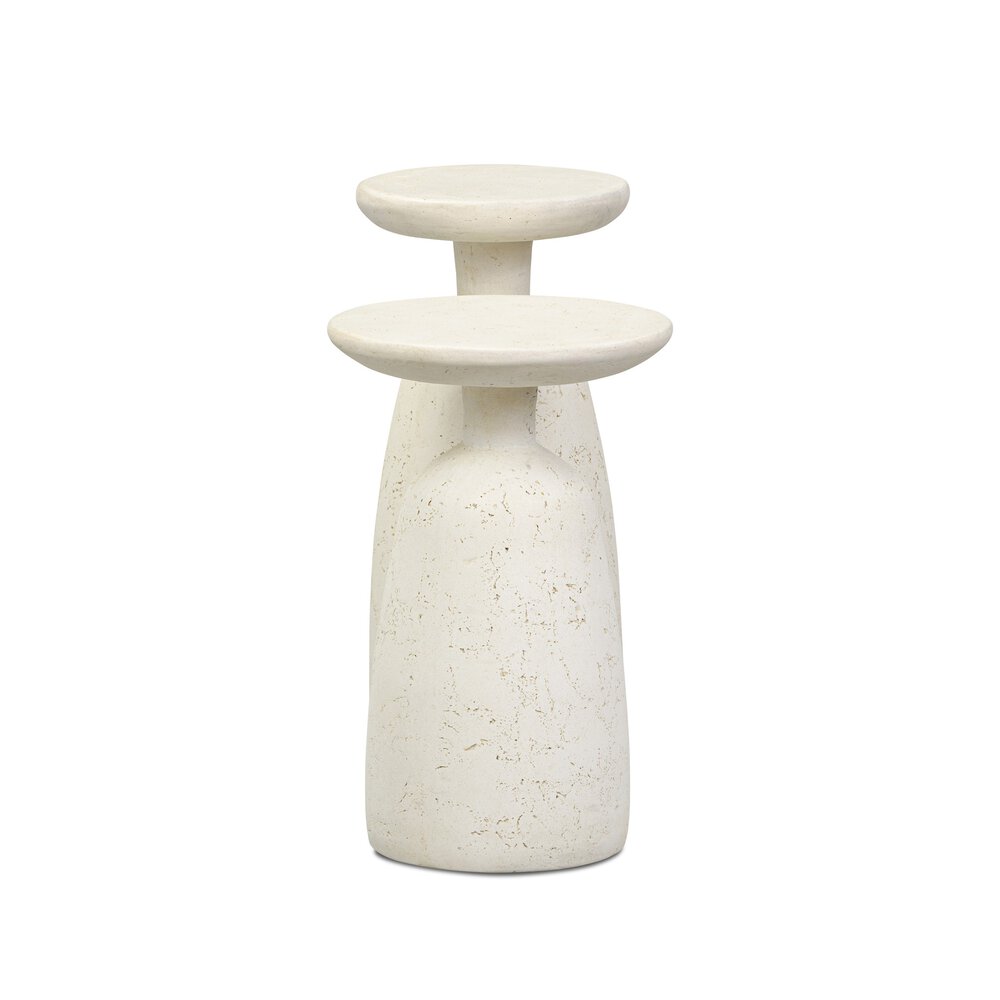 Enjoy the Ramara Outdoor Nesting End Tables in your home today! Proportion and shape interplay, forming a duo of outdoor nesting end tables. Shaped from aged white concrete with a parchment-like texture for softness and dimension. Cover or store indoors during inclement weather and when not in use.