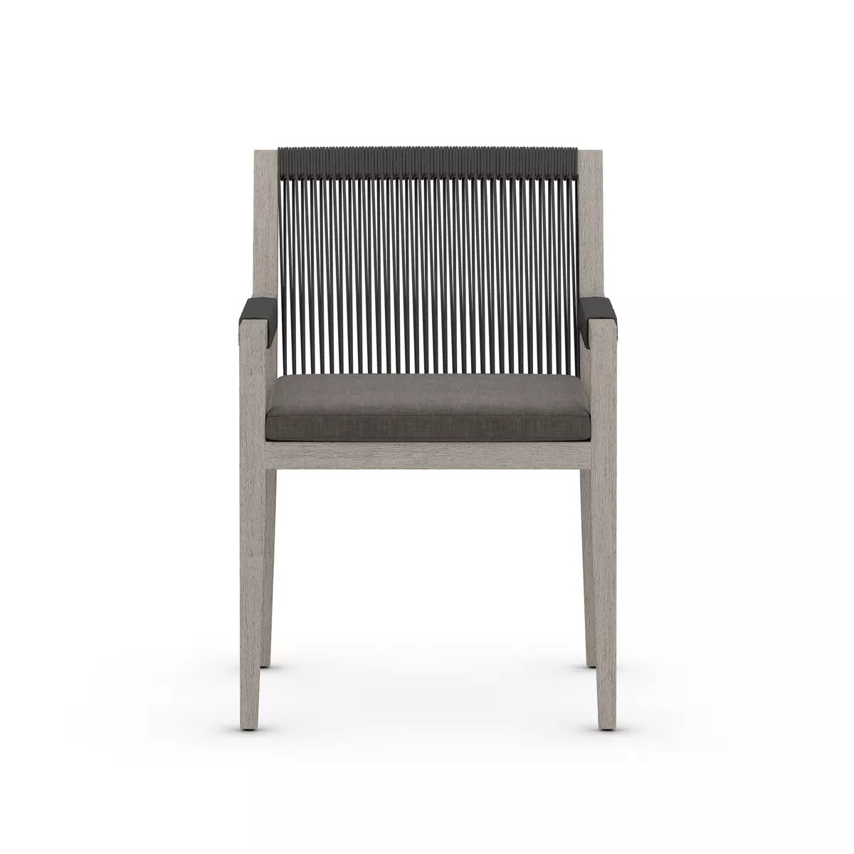 Enjoy the Sherwood Outdoor Dining Armchair, Weathered Grey - Charcoal in your home today! Modern materials ready a stylish silhouette for outdoor dining. Weathered grey teak forms a clean frame for UV-resistant and water-repellent Sunproof fabric in a deep charcoal. Cover or store indoors during inclement weather.