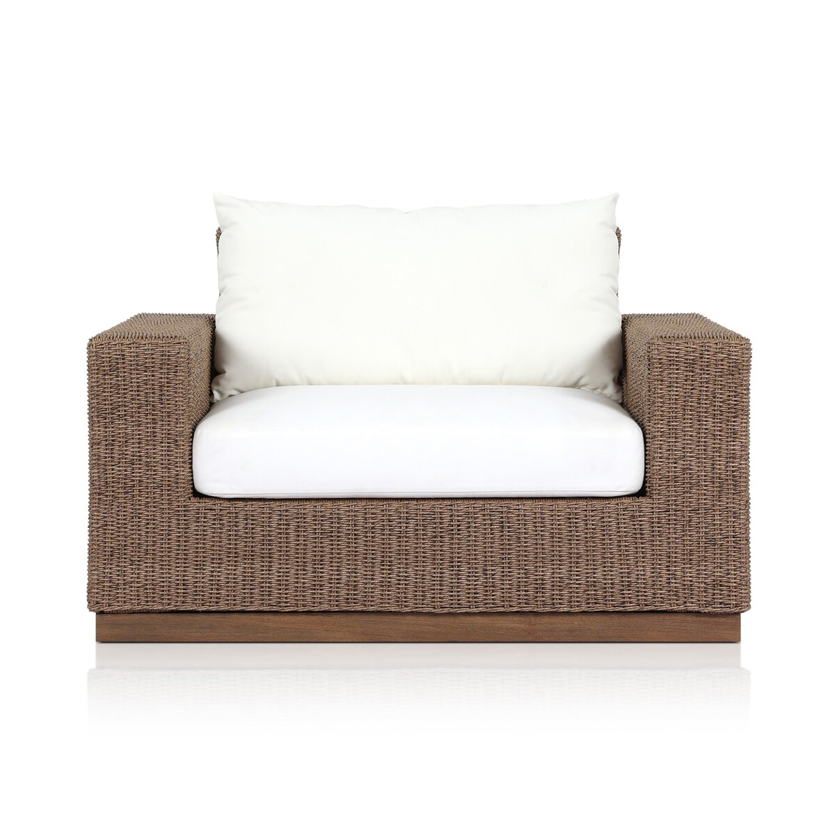 Enjoy the Suri Outdoor Chair in your home today! Elevate your outdoors. A wide-format outdoor chair features a faux hyacinth frame and plinth base. Linear details and a boxy silhouette make this piece truly timeless, while a knife-edge back cushion softens the whole look. Upholstered in 100% olefin, known for its UV-resistant, water-repellent and quick-drying abilities. Cover or store indoors during inclement weather and when not in use.
