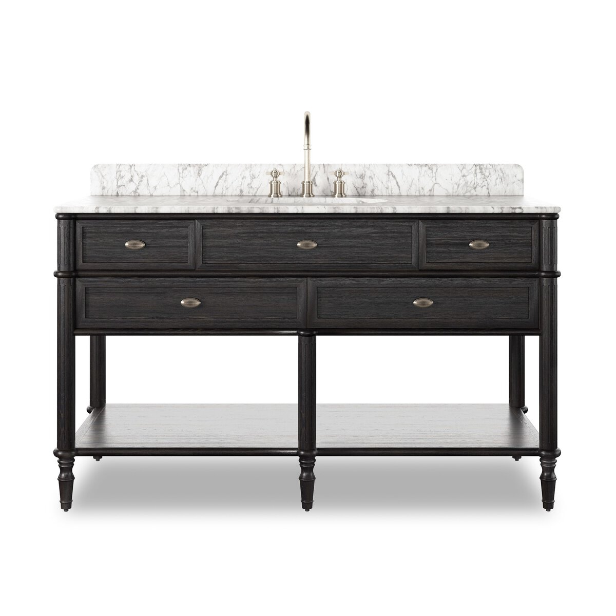 Enjoy the Toulouse Single Wide Vanity - Satin Black Veneer in your home today! Influenced by vintage European lines, this inspired bath vanity brings a sense of calm and serenity to the bath space. Crafted from solid oak and veneer with rounded corners and tapered spindle legs in a satin black finish, aged satin brass hardware and a Carrara marble top. Includes four functional drawers and a deep open shelf below. Finished with a bath-safe sealant for moisture resistance. Designed to accommodate 8”-widespread faucets and standard-size hardware for easy customization; faucet shown not included. Sink and backsplash included; backsplash ships separately. Removable back with cutouts for plumbing; fits standard P-trap. Professional installation required.