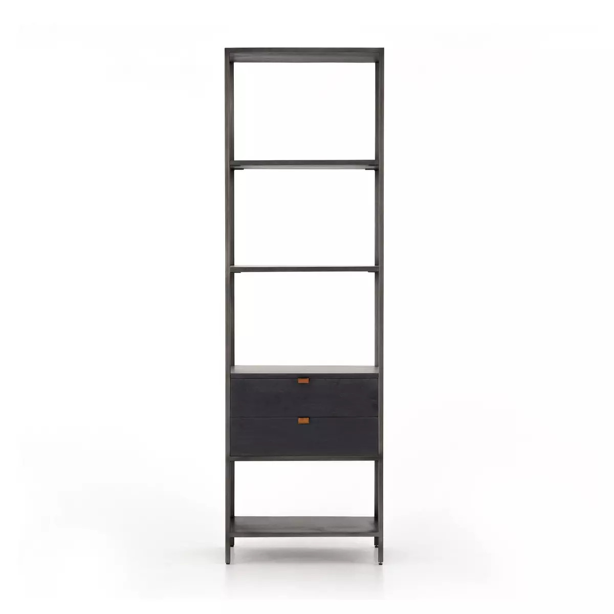 Enjoy the Trey Bookshelf - Black Wash Poplar in your home today! A stylish bookshelf of black-washed poplar offers ample storage space by way of open shelving and dual drawers. Metal-secured pulls of toffee top-grain leather add a textural element of surprise. Great solo, doubled, or paired with matching desk or filing