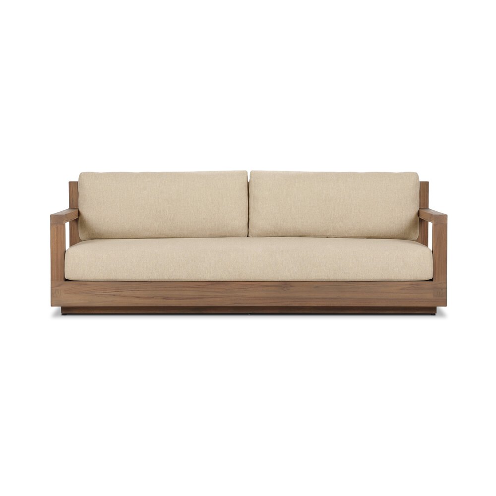 Enjoy the Venda Outdoor Sofa 86" in your home today! A simple outdoor seating style upholstered in durable neutral upholstery, framed out by FSC®-certified teak finished in a toasted brown. Tongue and groove joints on the seat base and a woven seat back elevate the whole look. Cover or store indoors during inclement weather and when not in use.