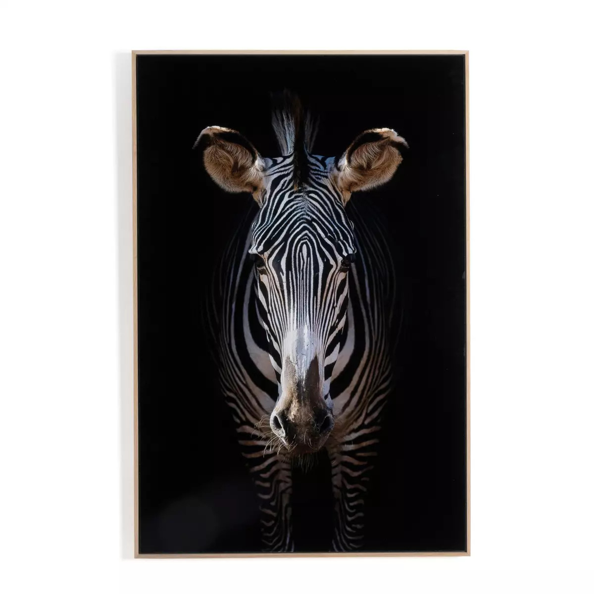 Enjoy the Zebra Stare by Getty Images - 32X48" in your home today! This stunning zebra portrait is a high-definition metal print produced on ChromaLuxe using dye sublimation print technology. Float-mounted in a vertical grain floater frame of white-finished American oak for a modern, museum-quality look. Image courtesy of Getty Images.
