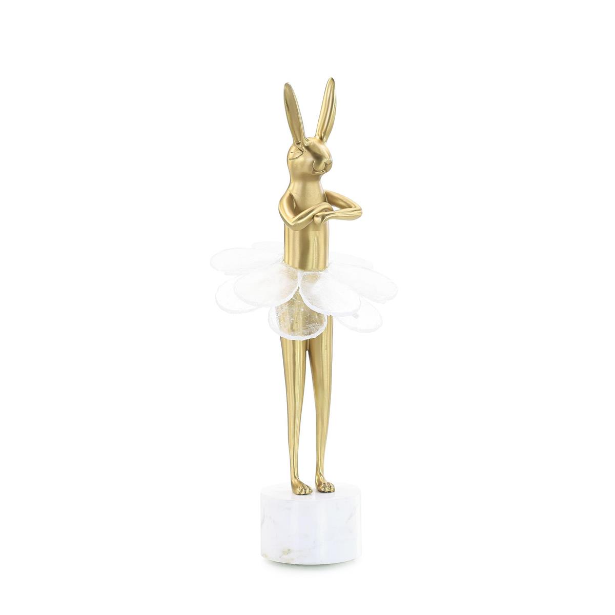 Enjoy the Ballerina Bunny Sculpture On Marble Base Ii in your home today! The Ballerina Bunny Sculpture is a lively decorative accent that contributes a sense of whimsy to an interior space. Crafted from brass, a tall bunny stands upright atop a circular base of white marble. The bunny is displayed wearing a gorgeous flower petal tutu made from natural selenite stone. *Marble is a naturally occurring stone mined for its beauty in various regions of the world. The chemical and mineral composition of the marble from the locale it is found, creates the vast array of color and pattern variations seen in this classic decorat