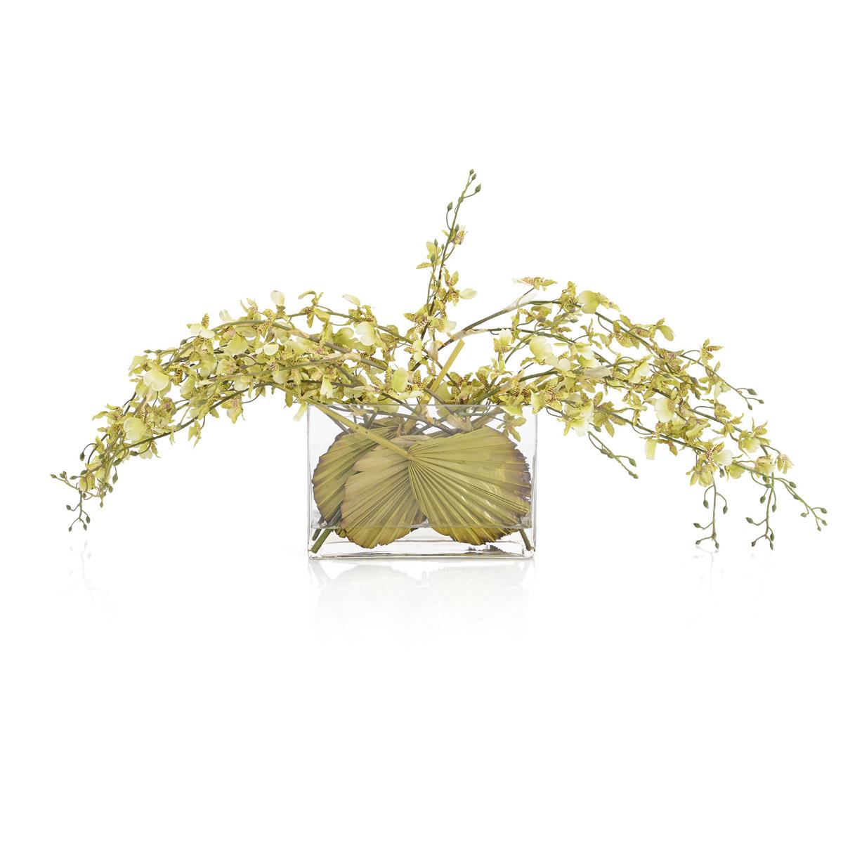 Enjoy the Evening Palms in your home today! Clear glass vase filled with natural dried fan palms and green orchids in faux water.