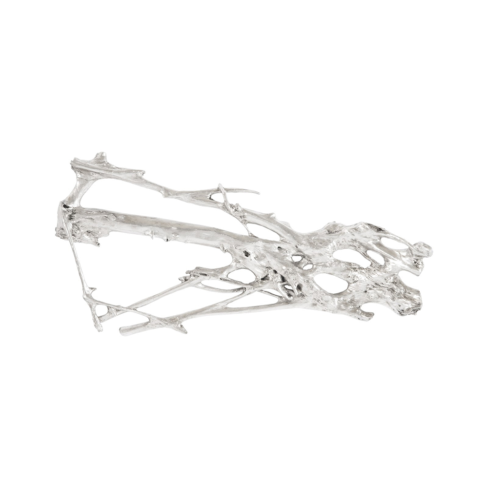 Enjoy the Root Wall Art - Large - Silver Leaf in your home today! This cast wall art was carefully chosen from a real wood root so we could replicate it in a variety of finishes. We loved the thin branches and how this particular root had a good amount of negative space, so as to not overbear a wall. Can be hung both vertically and horizontally. Disclaimer: The silver leaf finish applied to our products is known for its luxurious metallic appearance. However, this finish can be susceptible to scratching if not handled carefully. Silver leaf is a delicate material; abrasions may occur during routine use or contact with abrasive surfaces. To maintain the pristine condition of your silver leaf-finished items, we strongly recommend using coasters or protective pads when placing objects on the surface. These coasters act as a safeguard, minimizing the risk of scratches and preserving the beauty of the silver leaf finish. While we strive to provide durable and high-quality finishes, it's important to acknowledge that any abrasive or sharp objects in contact with the surface may lead to unintentional damage. Therefore, please be careful and follow proper care guidelines to ensure the longevity of your silver leaf-finished products.