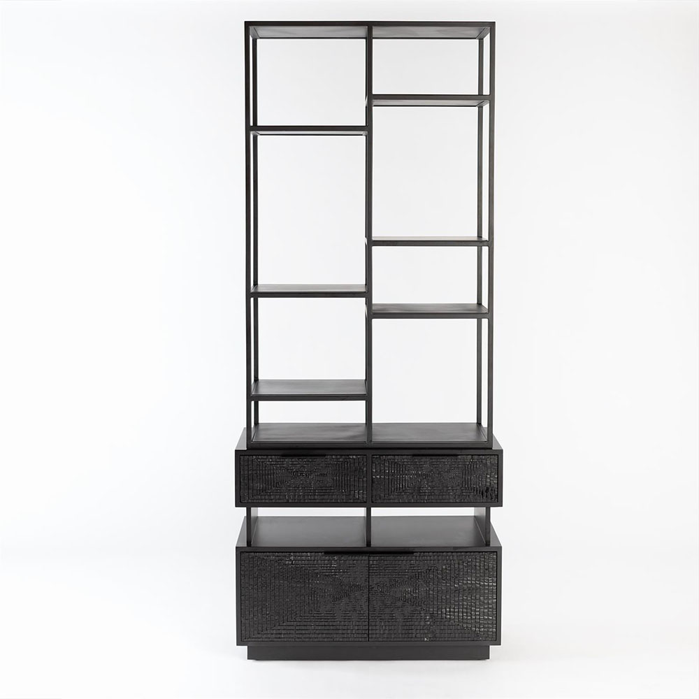 Enjoy the Kyoto Etagere in your home today! This painstaking carving process is aimed to show a different side of the natural beauty and texture of wood that is not usually seen on plain surfaces. The peaks and valleys created convey an abstract texture that is organic and sculptural in form. Painted in black, the texture mimics that of delicate charcoal with none of its instability. Constructed of Gmelina wood, a cousin to Beechwood. Matte black finish.
